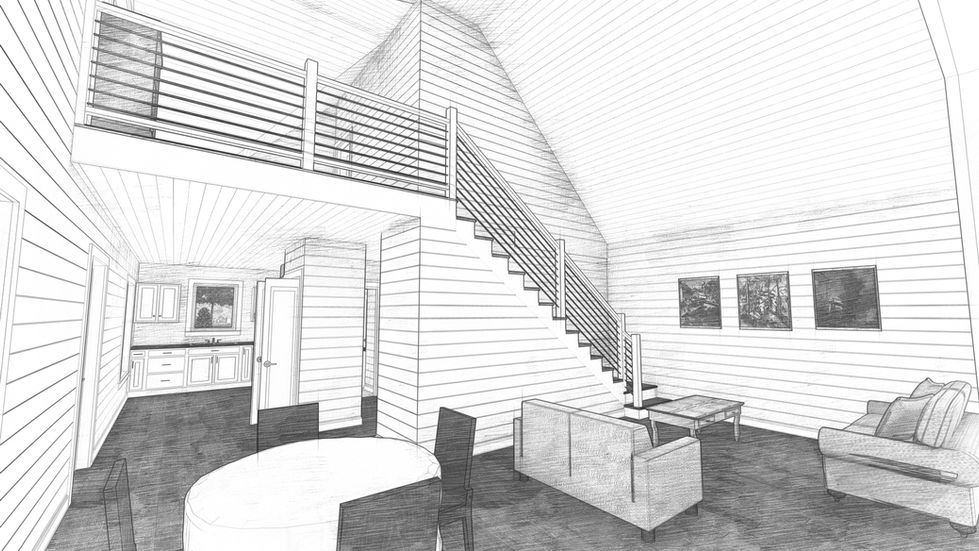 The Eddington is the perfect getaway house. Set for views, whether mountain or water, it does not disappoint. Each level has a bedroom and bathroom while the upper floor has a loft for a brief respite from the world. The living room provides soaring ceilings and abounding light. 1378 sq. ft.