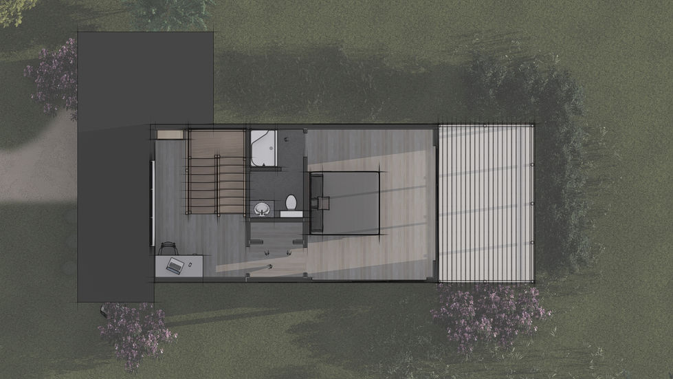 The Falmouth is an eclectic design that blends the feel of a camp with all its outdoor living with modern styling. Ideal as a retreat, This layout places living spaces and a half bath on the first floor, offering a front porch and a screen porch in the back. The second floor offers a small office space at the stair landing that leads to a private bathroom, bedroom and deck all while striking a balance between window and wall space.